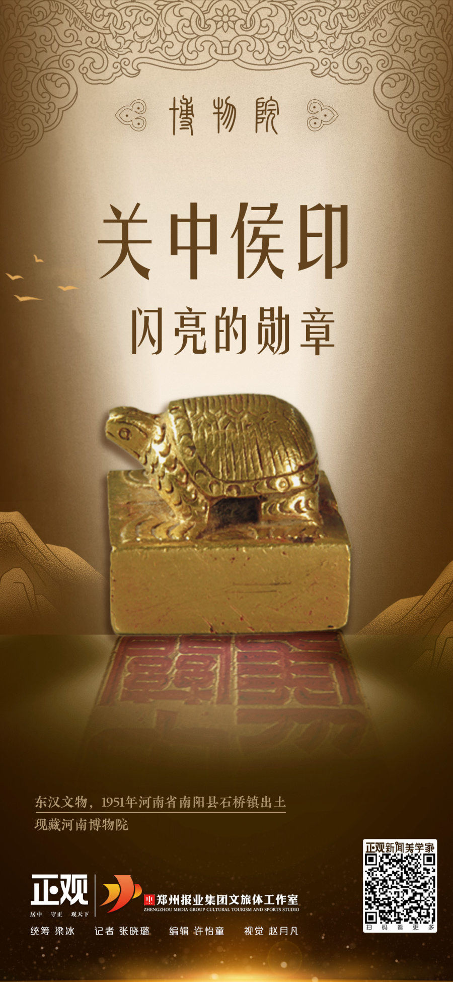 关中侯印,金质,东汉文物,通高2.2厘米,印面宽厘米,重128克。印面为正方形,阴文篆刻“关中侯印”四字。1951年河南省南阳县石桥镇出土,现藏河南博物院。