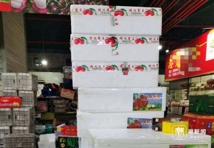 摊主们摆放的箱装荔枝。实习生 陶景成 摄