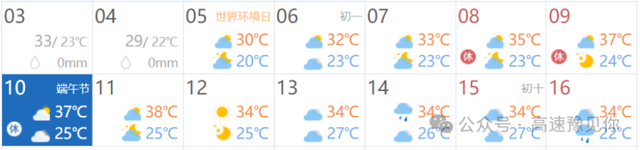 预测端午节假期全省天气以晴或多云为主,全省大部分地区最高气温将达到37℃左右。总体来看,节日期间天气条件利于公众出行。(天气预测仅供参考,最终以河南气象实际发布为准。)