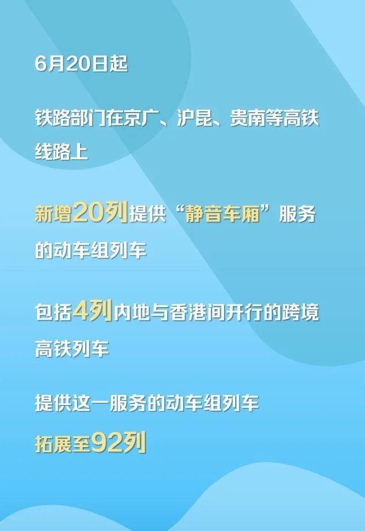 自6月20日起,铁路部门提供“静音车厢”服务的动车组列车新增20列,拓展至92列动车组列车,更好地满足广大旅客对美好旅行生活的需求。