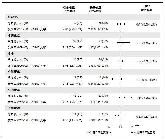 图3. 原研与仿制药组患者的心血管事件和死亡的发生风险比