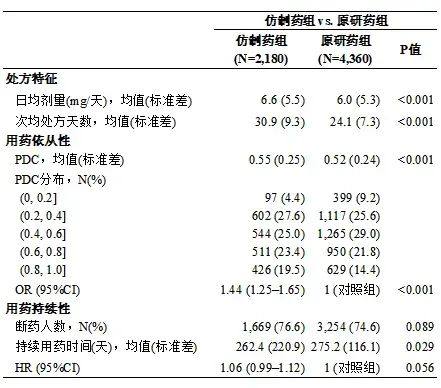 表1. 原研与仿制药组患者用药情况的差异