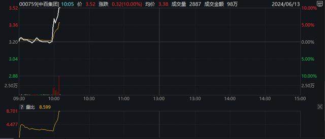 6月13日,中百集团盘中直线拉升,截至发稿,该股涨停,报3.52元,成交额超6800万元。