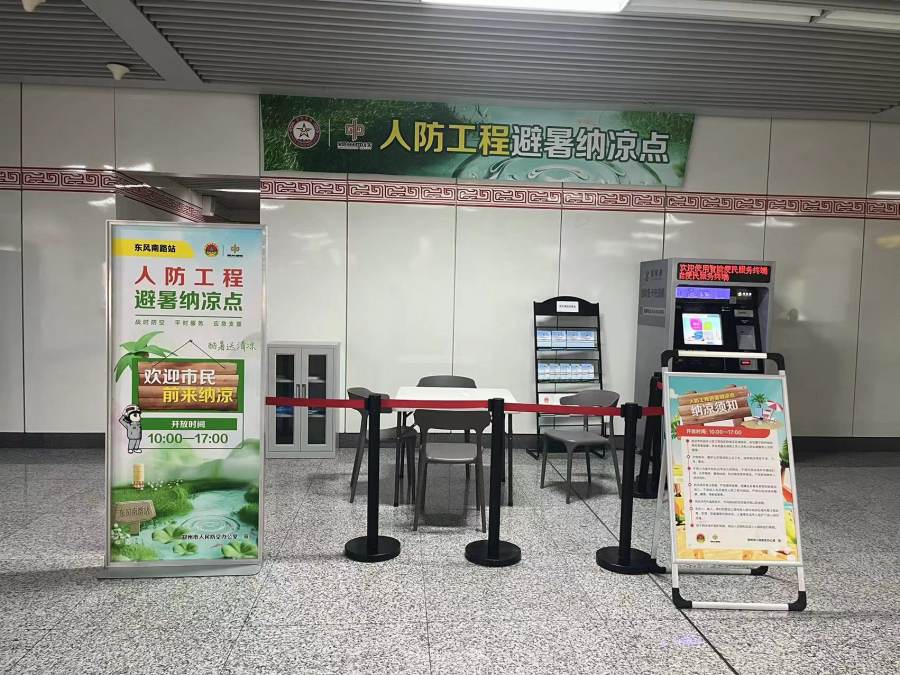 为了给市民提供更加安全、舒适、便利的避暑纳凉环境,去年我市首次设置了10处地铁站点为人防工程纳凉点,受到群众的欢迎和好评。伴随着地铁建成线路的增加,今年地铁纳凉点增至20处。今年结合地铁站点特色对纳凉点场地布置进行了精心设计,设置了国防知识、防灾减灾宣传展区,每个地铁站纳凉点位还配备了休息桌椅、报刊杂志、国防知识宣传资料、雨衣、防暑药品等物品。