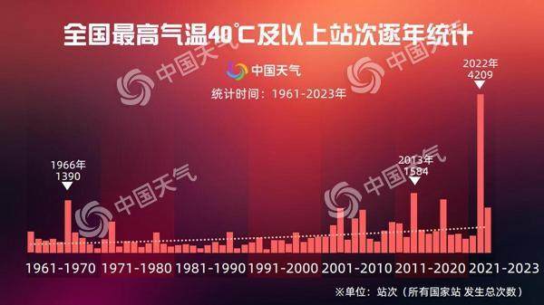 40℃以上的高温真的越来越常见了吗?通过盘点1961年至2023年气象大数据发现,这62年中,全国国家级气象观测站出现40℃及以上的高温总体确实呈现增长趋势,其中2022年最多,高达4209站次。