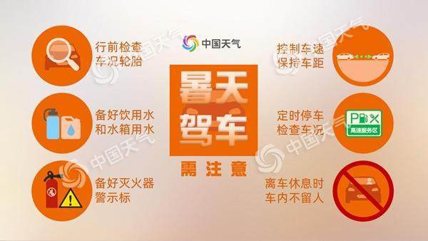 在交通出行方面,随着地表温度升高,户外行车容易发生爆胎、自燃等状况,影响行车安全。当气温≥35℃或者路面温度≥65℃时,爆胎危险性大大增加。行车前要仔细检查车况,备好灭火器、警示标,如果长时间行驶在高速公路上,应定时前往服务区休息,给轮胎降温温。