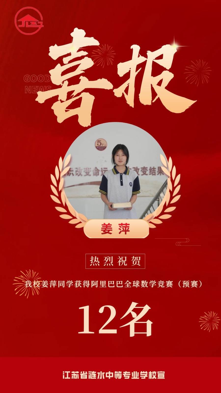 喜报图 图据江苏省涟水中等专业学校