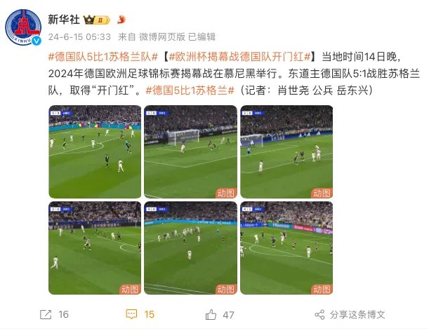 北京时间6月15日03:00,2024年欧洲杯揭幕战在慕尼黑竞技场进行,东道主德国队以5-1的比分大胜苏格兰队,自2016年欧洲杯以来首次在大赛中取得开门红。