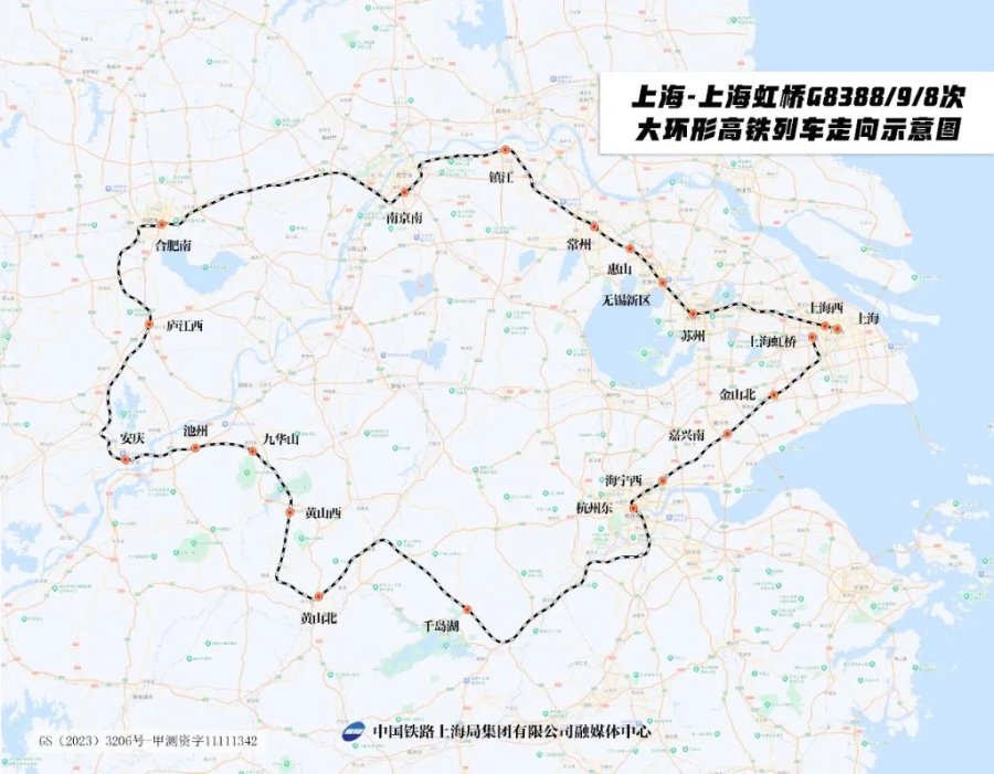 张佳乘坐的是从上海出发的“超级高铁环线”——G8388/9/8次列车。该车次从上海出发,横跨沪苏浙皖三省一市,将上海、南京、合肥、杭州等4座长三角中心、副中心城市串联,形成一个大环形,是连接长三角的“超级高铁环线”。