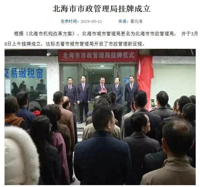 记者查询资料了解到,根据公众号“北海市政”2019年3月8日消息,根据《北海市机构改革方案》,北海市城市管理局更名为北海市市政管理局,并于2019年3月8日上午挂牌成立。该公众号同日发布的消息还称,2019年3月8日上午,北海市综合行政执法局也举行了挂牌仪式,根据《北海市机构改革方案》住房和城乡建设、自然资源、交通运输、生态环境、工业和信息化、旅游文体广电、商务、人力资源和社会保障等11个领域的行政执法职责整合,组建市综合行政执法局,作为市政府的工作部门。
