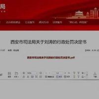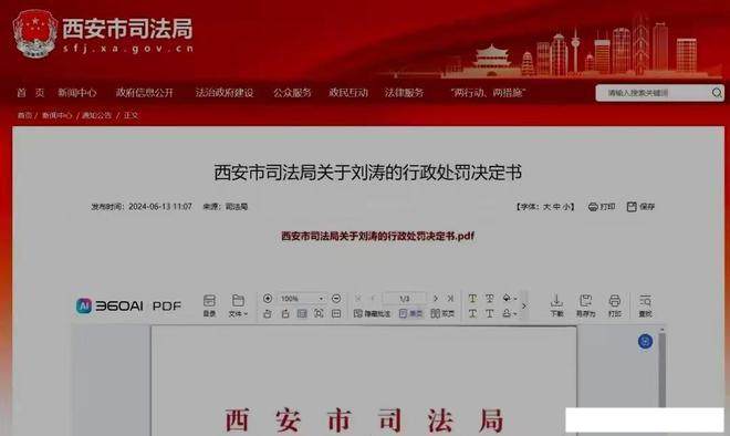 2024年6月13日,西安市司法局官网上发布的关于刘涛的行政处罚决定书(目前已删除)