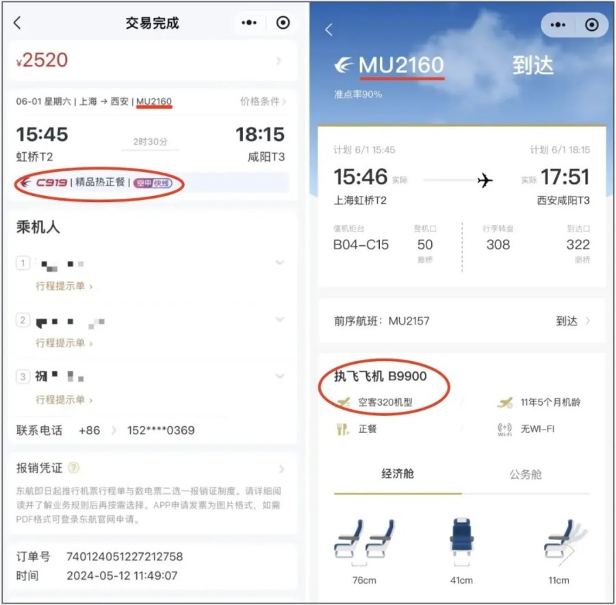 6月1日,祝先生一家从上海返回陕西西安。此前,他通过东航小程序订票时,页面显示当天15点45分上海飞西安的MU2160次航班的执飞机型是国产大飞机C919。为了体验这款新机型,尽管当天有更便宜的机票,他还是毫不犹豫地买了这趟航班。但登机后祝先生却发现,自己乘坐的机型并非C919。
