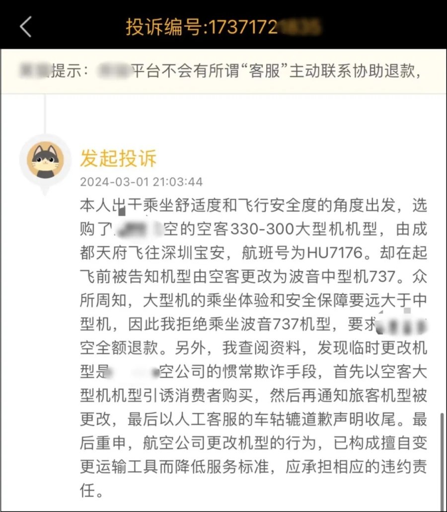记者在某互联网投诉平台上搜索发现,有多家航空公司因临时更改机型被消费者投诉,多位消费者质疑航空公司存在涉嫌虚假宣传等问题。其中不少投诉内容为“航空公司临时将大机型更改为小机型,对明显存在差异的乘坐体验不作补偿”,乘客选择退票,又被扣手续费。