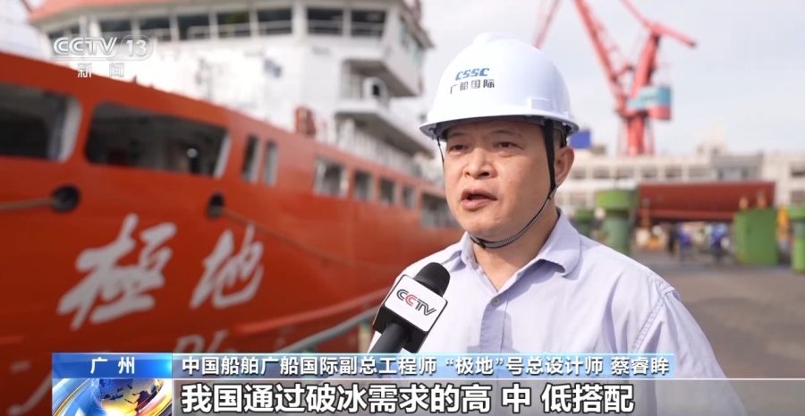 中国船舶广船国际副总工程师 “极地”号总设计师 蔡睿眸:在设计吃水、电力推进全功率的时候,本船在1米厚的当年冰中,破冰航速能够达到2节。