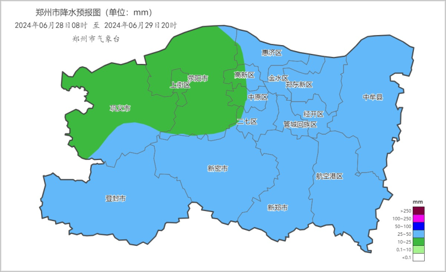 图1 2024年6月28日08时至29日20时郑州市降水量预报图