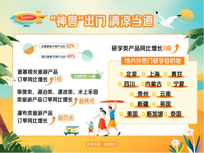 亲子研学类产品仍然备受欢迎,相关产品订单同比去年增长7成,价格与去年基本持平。北京、上海、青甘、四川、内蒙古、宁夏、贵州、云南、新疆等为国内热门游学目的地,海外的英国、美国等长线游学路线,新加坡、泰国等短线游学路线受欢迎,名校参访、亲近自然等各类主题游产品销量靠前。
