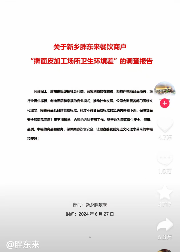 6月27日凌晨,“胖东来商贸集团”官方公号发布《关于新乡胖东来餐饮商户“擀面皮加工场所卫生环境差”的调查报告》称,对于帮助发现重大食品安全隐患的顾客,给予该顾客10万元现金奖励;对所有于2024年6月9日至2024年6月19日期间在新乡胖东来两店餐饮部购买擀面皮、香辣面的顾客办理退款,给予1000元补偿(共计8833份);并对胖东来相关工作人员予以辞退、免职、取消年终福利;要求新乡胖东来擀面皮商户即日起停止营业,并解除合同终止合作,限期撤柜。