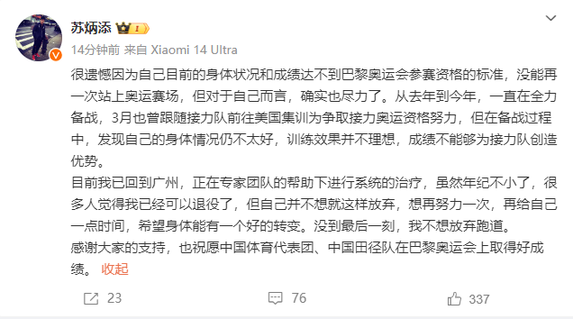 近日,中国短跑名将苏炳添在接受媒体采访时确认,将缺席巴黎奥运会田径比赛。 7月5日,@苏炳添 发文回应:很遗憾因为自己目前的身体状况和成绩达不到巴黎奥运会参赛资格的标准,没能再一次站上奥运赛场,但对于自己而言,确实也尽力了。从去年到今年,一直在全力备战,3月也曾跟随接力队前往美国集训为争取接力奥运资格努力,但在备战过程中,发现自己的身体情况仍不太好,训练效果并不理想,成绩不能够为接力队创造优势。