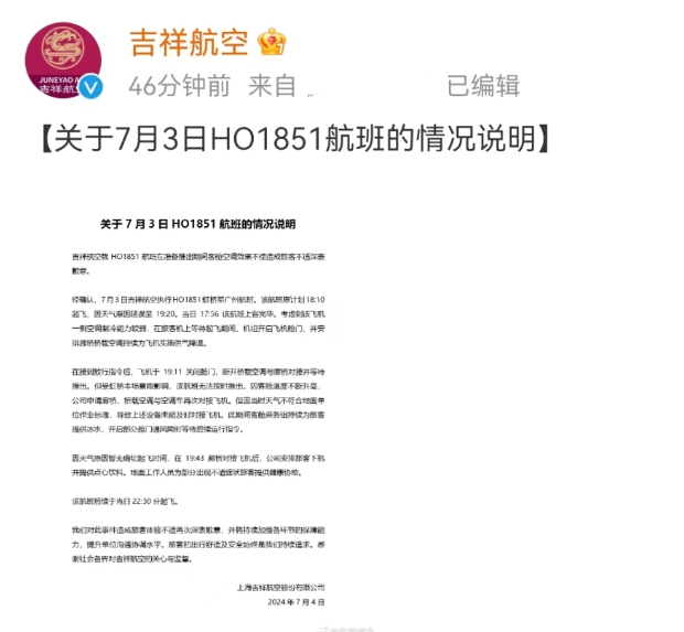 7月3日,有网友反映,吉祥航空上海飞广州一航班,因不明原因延误,而舱内却未开空调,导致有旅客中暑。7月4日,吉祥航空对此发布情况说明。