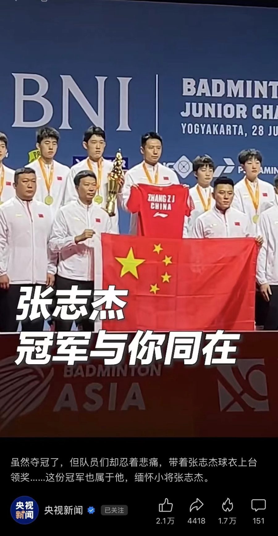 6月30日,在印度尼西亚举办的2024亚洲青年羽毛球锦标赛中,17岁中国羽毛球运动员张志杰突然昏厥,送医后抢救无效去世。