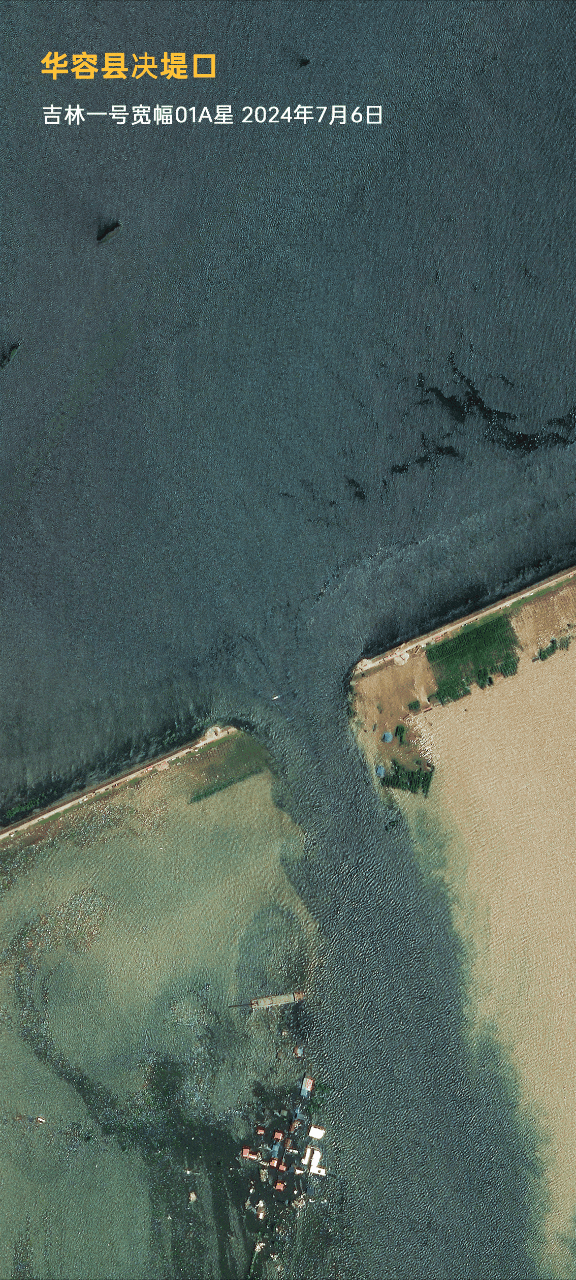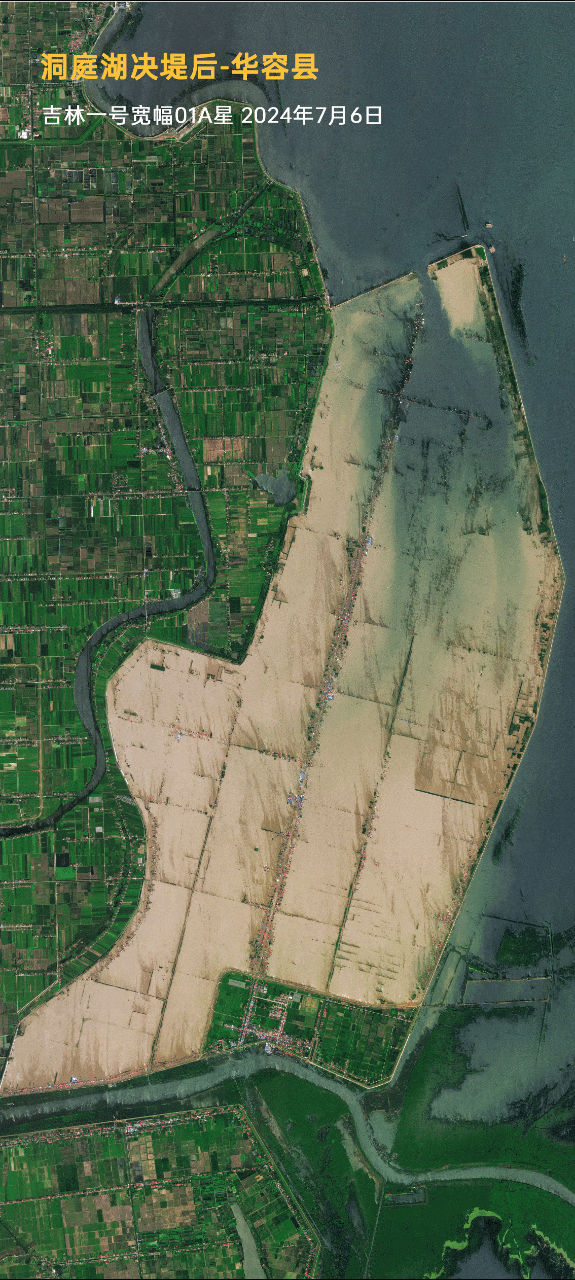7月6日11时10分,“吉林一号”宽幅01A星拍摄到洞庭湖决堤后高分辨率卫星影像,此时团洲垸溃口宽度已延伸至226米,与较早前拍摄影像相比,当地被淹情况严重。