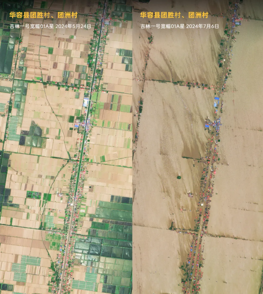 为掌握受灾区域实时情况,长光卫星紧急调度“吉林一号”宽幅01A星过境岳阳华容县,对灾区进行观测;并在成像后第一时间提供给相关单位,助力抗洪救灾工作。