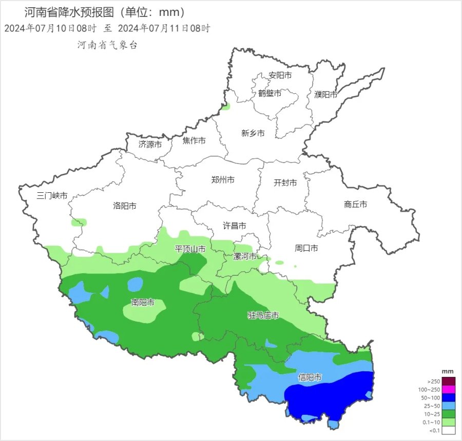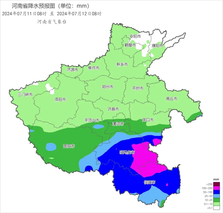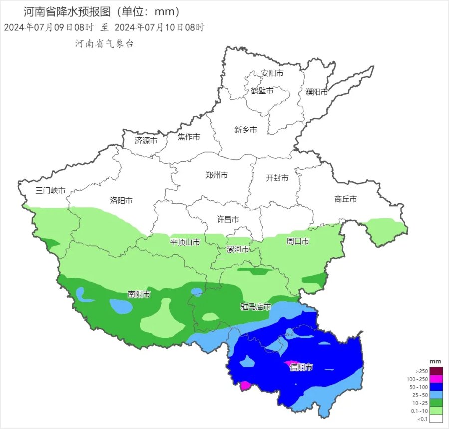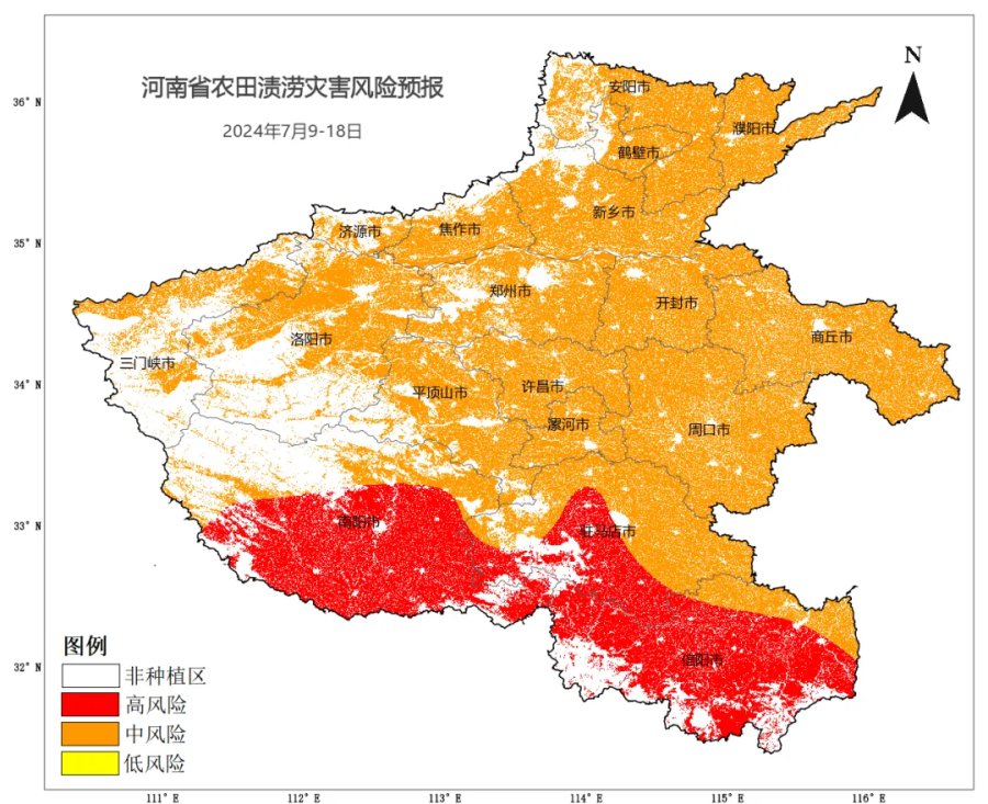 河南省气象局、河南省农业农村厅2024年7月8日联合发布农田渍涝灾害中风险预警:预计未来10天我省降水偏多,黄淮之间部分县市有大到暴雨、局部大暴雨,并伴有短时强降水等强对流天气,降水落区重叠,全省大部有农田渍涝灾害风险,南阳、信阳、驻马店局部风险较高。
