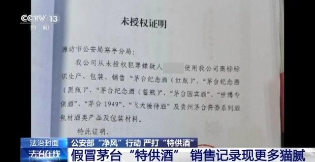 根据直播平台要求,如果要售卖某品牌的商品,必须提供相关的经营资质,办案民警立即和贵州茅台酒厂取得联系,企业方称,自己从未授权这两个直播间卖酒,而经过鉴定,那些打着茅台名义售卖的多种所谓“特供酒”,压根就不是产自茅台酒厂,警方分析,这两个直播间售卖的酒水极有可能是假酒。