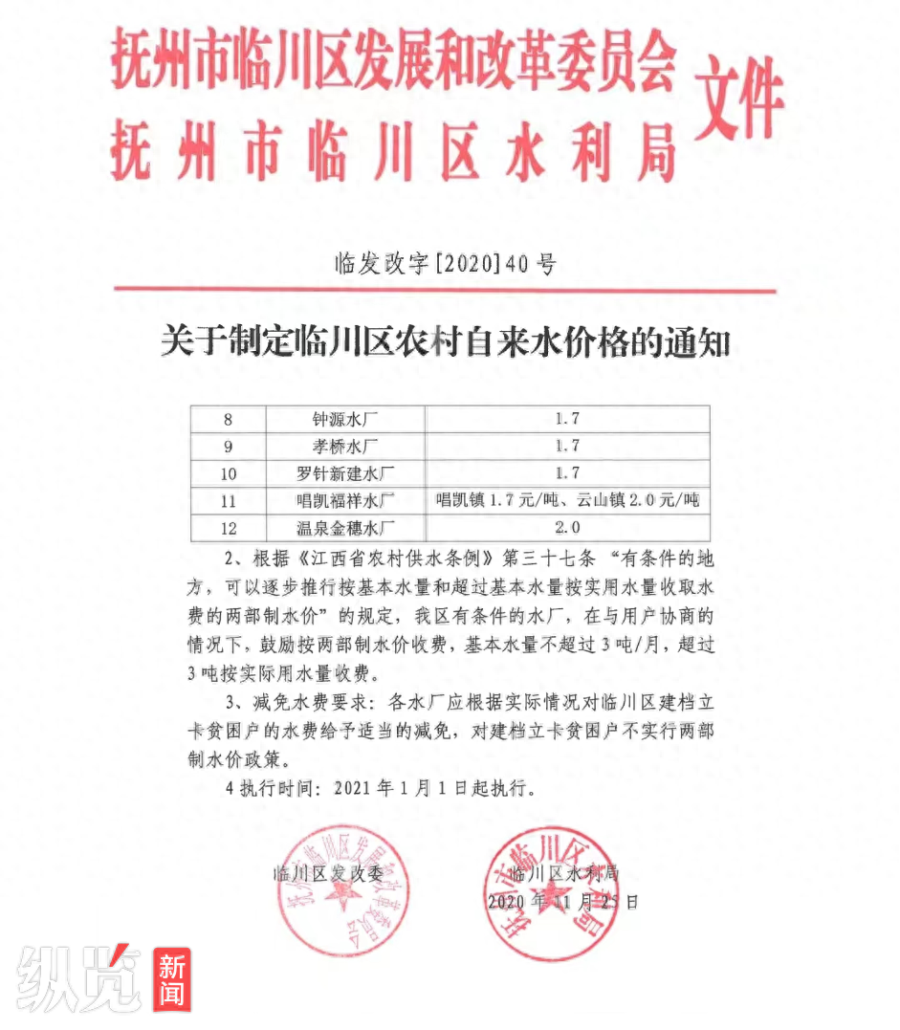 关于制定临川区农村自来水价格的通知。(来源/临川区人民政府官网)