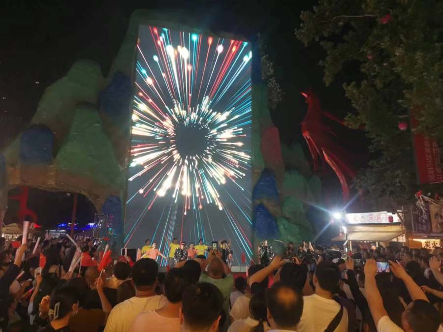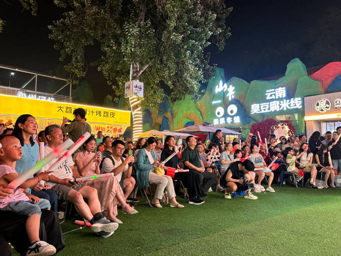 观众大部分是衣着时尚、朝气蓬勃的年轻人,各种各样的特色门店和美食小吃摊吸引着人们的眼球,使得园区内的夜经济更显热闹非凡。