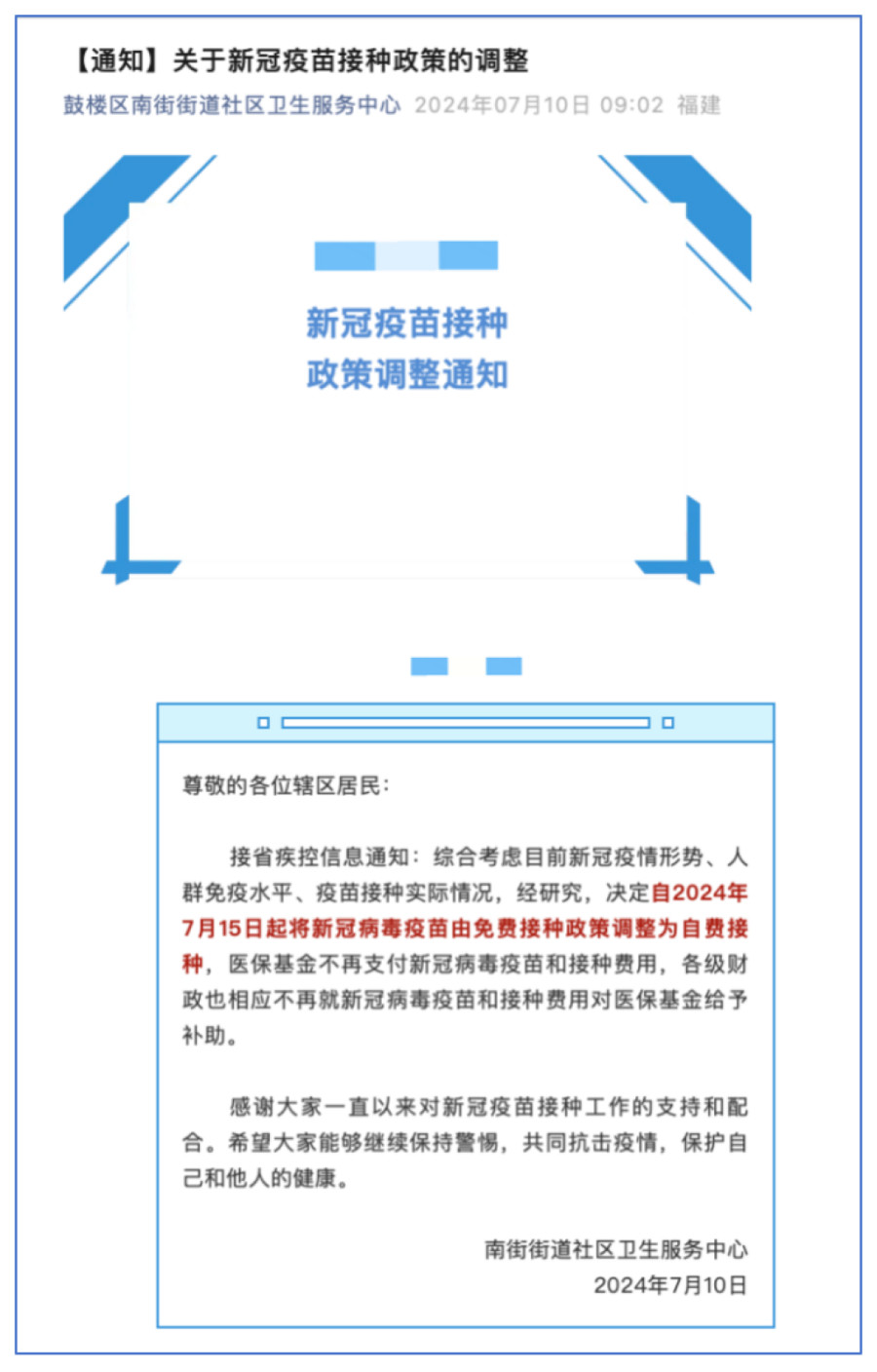 7月10日,福建省福州市鼓楼区南街街道社区卫生服务中心官微发布“新冠疫苗接种政策的调整”,通知中称“自2024年7月15日起将新冠病毒疫苗由免费接种政策调整为自费接种,医保基金不再支付新冠病毒疫苗和接种费用,各级财政也相应不再就新冠病毒疫苗和接种费用对医保基金给予补助”。