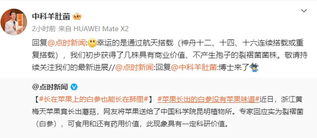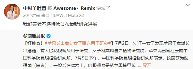 7月11日,许容聚博士回应表示,“感谢博主把苹果寄过来,我们已经切开观察并接种,这株菌株非常强壮,有研究价值。”