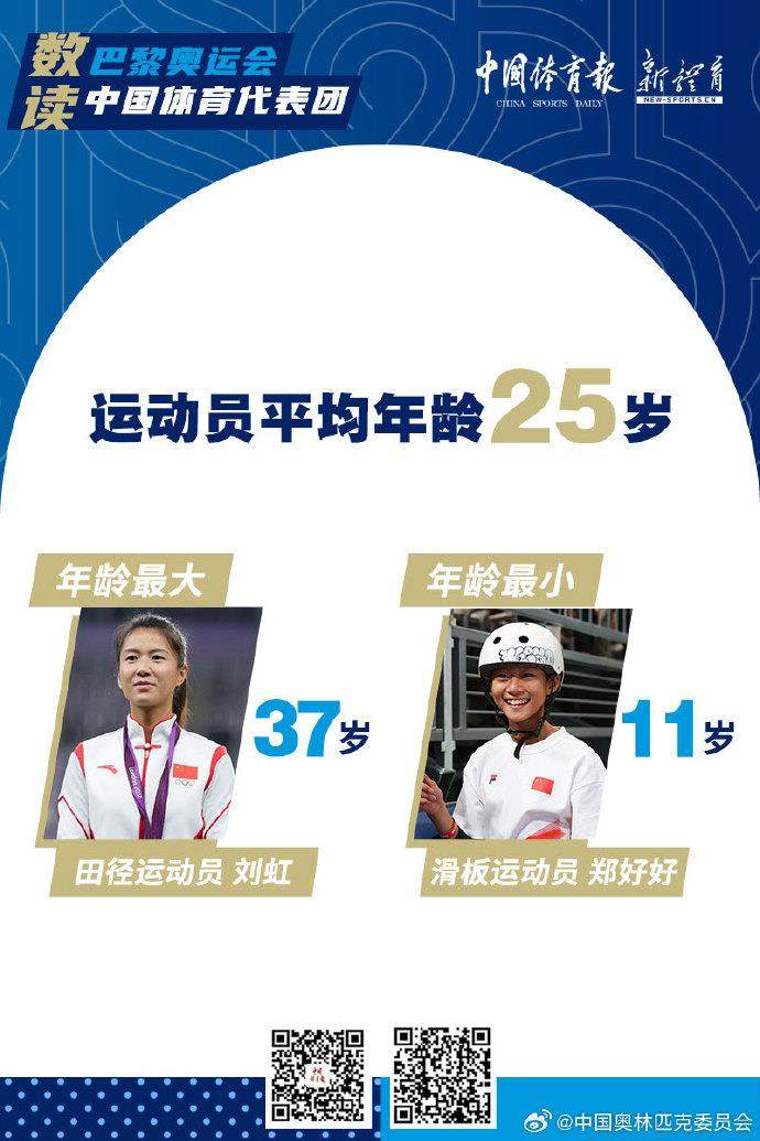 代表团运动员平均年龄25岁,年龄最大的37岁(田径运动员刘虹),年龄最小的11岁(滑板运动员郑好好)。其中有42位奥运冠军,223人为首次参加奥运会。