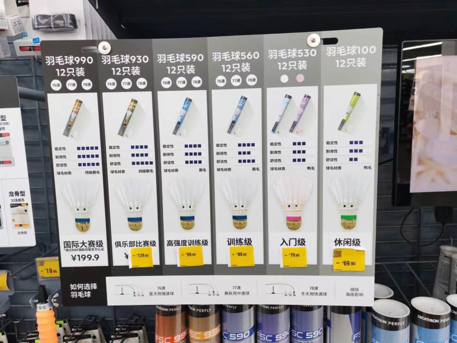 在综合运动超市迪卡侬,记者在羽毛球区,看到有6款天然羽毛球销售。有妈妈在帮助孩子挑选羽毛球装备,“我平时自己打球,用的是89.9元的这个鹅毛球,还算不错。”在天然羽毛球中,鹅毛球比鸭毛球,球感更好、更耐用、价格也更贵。迪卡侬鹅毛球中最便宜的,就是每桶89.9元,被标注为训练级。这里最贵的鹅毛球每桶199.9元,被标注为国际大赛级,而且通过了国际羽联官方认证。迪卡侬最便宜的入门级鸭毛球,每桶69.9元,是卖得最好的,货架上只剩寥寥几桶。