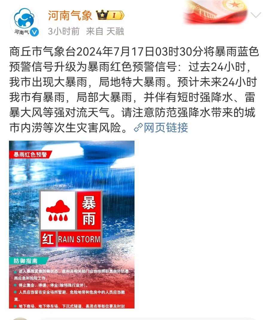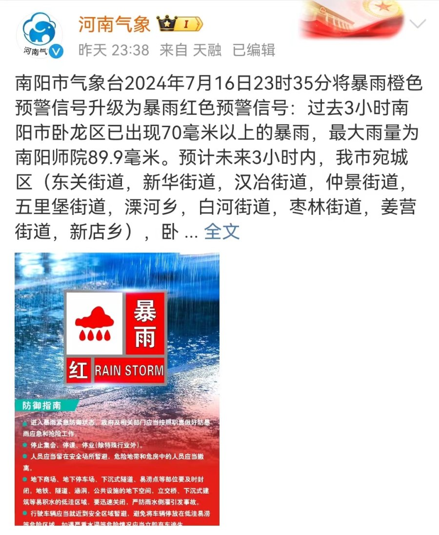 河南省气象台2024年7月16日18时30分升级发布暴雨红色预警:过去24小时,我省西南部、中东部出现暴雨、大暴雨,其中南阳、漯河、许昌、周口、商丘等地局部出现特大暴雨。预计未来24小时,我省黄淮之间及焦作、济源、新乡南部有大到暴雨,其中济源、焦作南部、郑州西部、三门峡北部、洛阳北部、南阳北部、平顶山南部、许昌东部、漯河北部、周口北部、开封南部、商丘部分县(市、区)有大暴雨,局部特大暴雨,并伴有短时强降水(最大小时雨强50到80毫米,个别站点100毫米以上)、雷暴大风(8到10级)等强对流天气。请密切关注属地气象部门发布的最新预报信息和气象灾害预警信号,做好防范应对工作。上述地区的相邻县(市、区)也需关注。