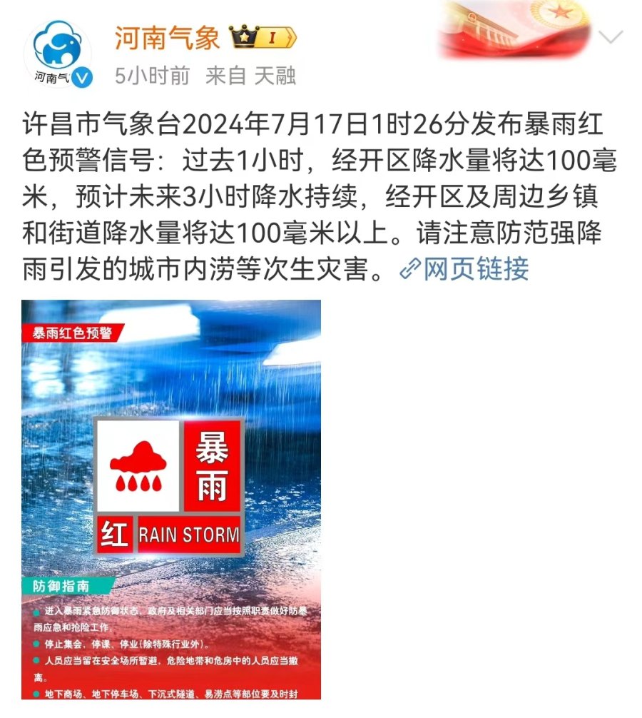 河南省气象台2024年7月16日18时30分升级发布暴雨红色预警:过去24小时,我省西南部、中东部出现暴雨、大暴雨,其中南阳、漯河、许昌、周口、商丘等地局部出现特大暴雨。预计未来24小时,我省黄淮之间及焦作、济源、新乡南部有大到暴雨,其中济源、焦作南部、郑州西部、三门峡北部、洛阳北部、南阳北部、平顶山南部、许昌东部、漯河北部、周口北部、开封南部、商丘部分县(市、区)有大暴雨,局部特大暴雨,并伴有短时强降水、雷暴大风(8到10级)等强对流天气。省防汛抗旱指挥部已针对包括我市在内的13个省辖市启动防汛二级应急响应。郑州市气象局7月16日21时发布重要天气预警报告(暴雨橙色):16日夜里至17日夜里我市有大到暴雨,西部大暴雨,并伴有短时强降水、雷暴大风等强对流天气。累计雨量50~70毫米,局部90~130毫米,最大小时雨强40~60毫米。根据《郑州市防汛应急预案》有关规定,经综合会商研判,市防汛抗旱指挥部决定于7月16日21时30分将防汛三级应急响应提升至二级。