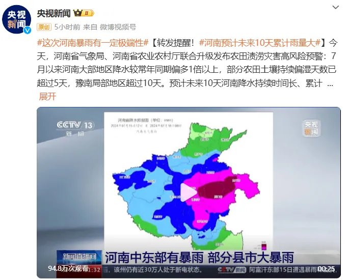 河南省气象局、河南省农业农村厅16日联合升级发布农田渍涝灾害高风险预警:预计未来10天河南降水持续时间长、累计雨量大、暴雨落区重叠度高,且有一定极端性,全省大部农田渍涝灾害风险较高。