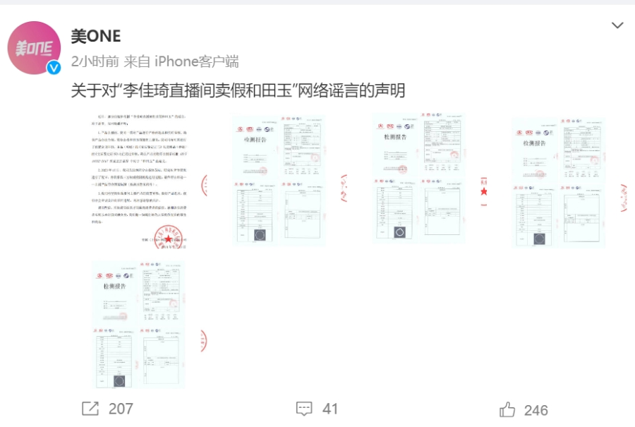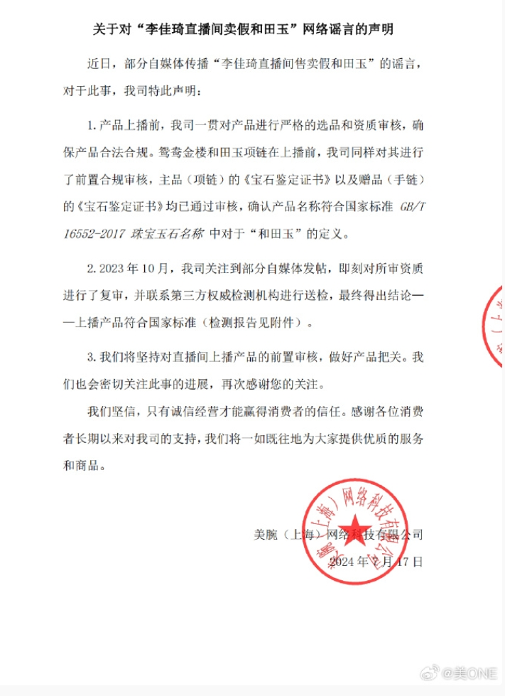7月17日晚间,@美ONE 发布关于对“李佳琦直播间卖假和田玉”网络谣言的声明。