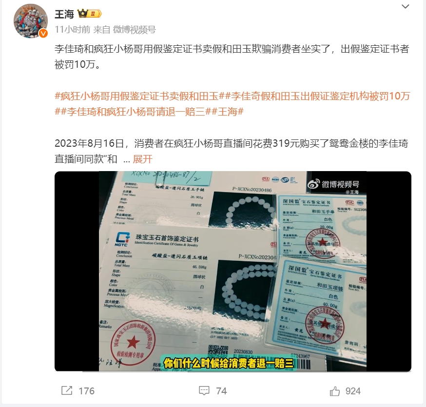 7月17日,知名打假人@王海发文称:李佳琦和疯狂小杨哥用假鉴定证书卖假和田玉欺骗消费者坐实了,出假鉴定证书者被罚10万元。