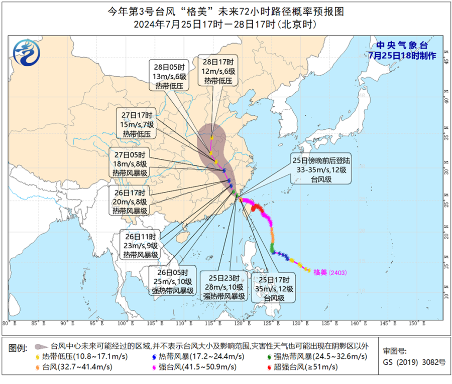 25日、26日,“格美”主要影响台湾、福建、浙江、江西等地,局地累计降雨量具有极端性。根据预报,7月25日20时至26日20时,浙江南部、福建大部、江西中东部、广东东部、湖南东南部、台湾等地有大到暴雨,其中,浙江东南部、福建东部、广东东南部、台湾西南部等地部分地区有大暴雨到特大暴雨;上海、江苏南部、安徽南部、江西大部、福建大部、浙江大部等地将有5至6级、阵风7至8级风,东海南部及钓鱼岛附近海域、台湾海峡、台湾以东洋面、台湾沿海、福建沿海、浙江东南部沿海的风力有9至10级,部分海域或地区风力可达11至12级、阵风13至14级。