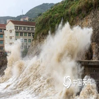7月25日,受台风“格美”影响,浙江省温岭市金沙滩海域掀起十米多高的巨浪。