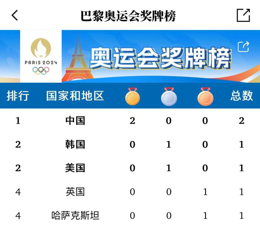 半小时两金!巴黎奥运会首日,中国队领跑奖牌榜