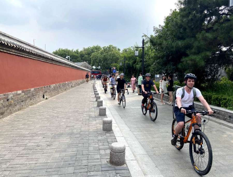 图为中外青年在北京鼓楼附近骑行体验。