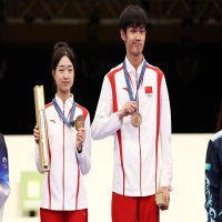 7月27日,巴黎奥运会射击混合团体10米气步枪金牌得主——盛李豪、黄雨婷在颁奖仪式上。他们收到的长条形盒子,其实是官方海报。