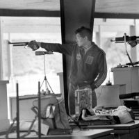 1984年7月29日,中国运动员许海峰(右)在洛杉矶奥运会男子自选手枪射击比赛中。新华社记者 官天一 摄(传真照片)