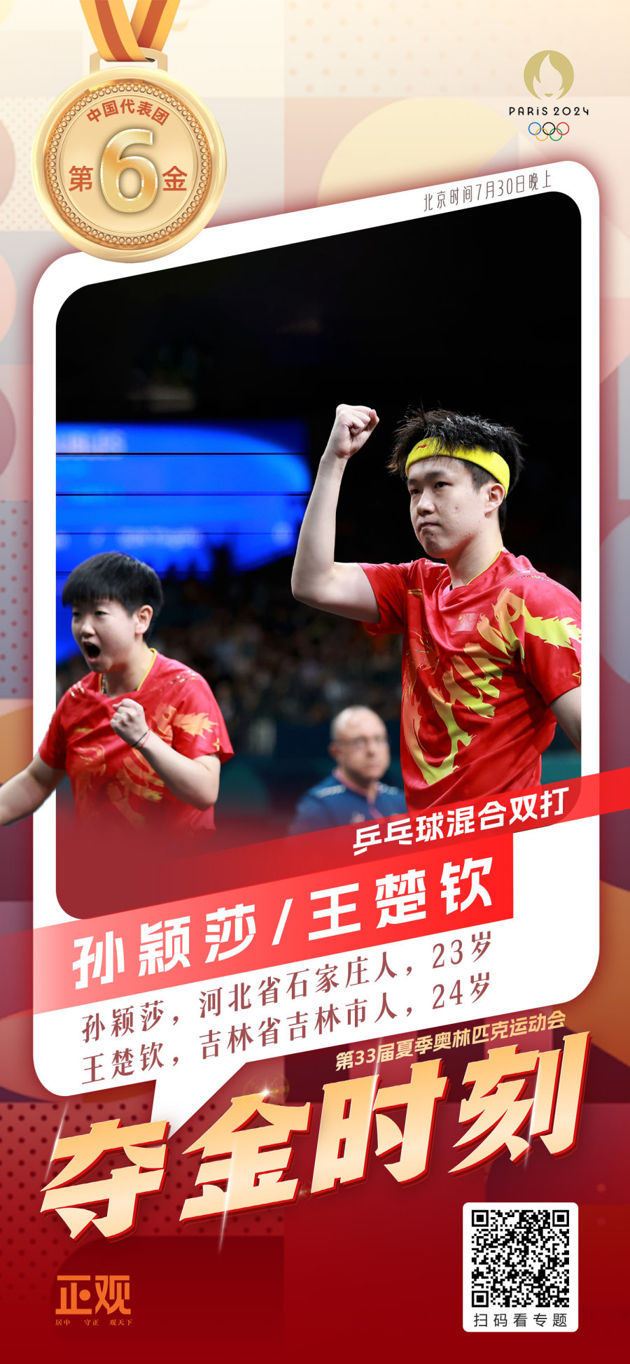 国乒巴黎奥运首金!“莎头”混双夺冠