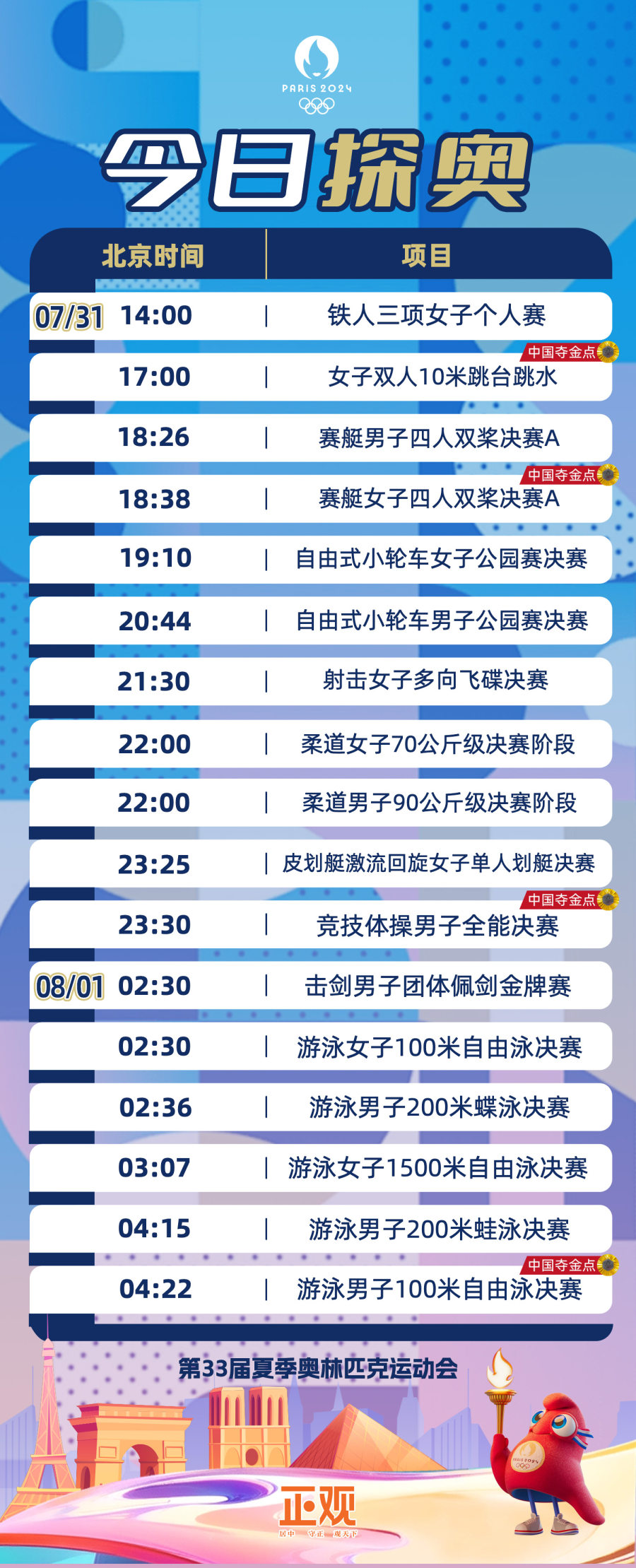 北京时间8月1日凌晨的游泳比赛中,潘展乐将以半决赛排名第一的身份出战男子100米自由泳决赛;中国选手李冰洁将出战女子1500米自由泳决赛;杨浚瑄将出战女子100米自由泳决赛;董志豪出战男子200米蛙泳决赛。