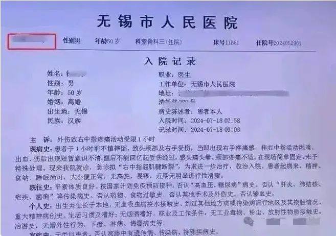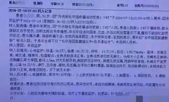 网友贴出的病例显示,一名伤者7月18日凌晨3点入住该院骨科,病例记载:患者于1小时前不慎摔倒,致头颈部及右手受伤,当即出现右手痛感,伴右中指活动困难出血,伤后出现短暂意识不清,醒后不能回忆起受伤经过,感头痛头晕、颈部疼痛不适。
