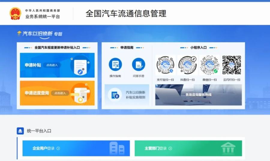 补贴如何申请?符合补贴条件并有意愿申请补贴资金的个人消费者,应于2025年1月10日24时前,通过登录全国汽车流通信息管理系统网站(https://qclt.mofcom.gov.cn)或通过支付宝、抖音、微信、云闪付等平台搜索“汽车以旧换新”小程序,清晰、完整、准确填报提交申报材料。