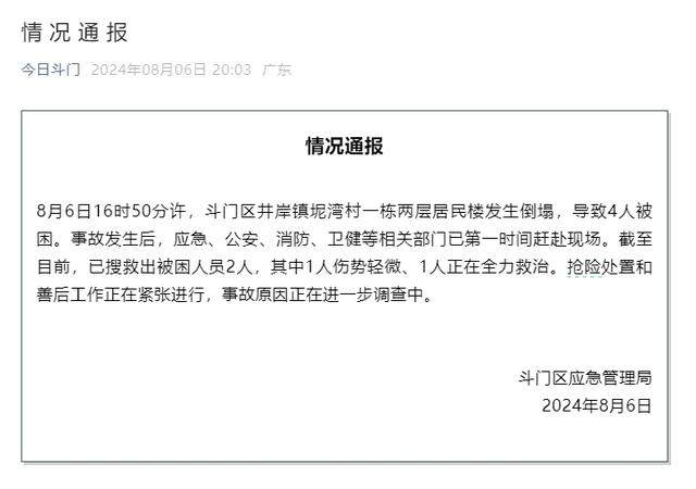 据“今日斗门”微信公众号消息,广东省珠海市斗门区应急管理局6日发布通报称,8月6日16时50分许,斗门区井岸镇坭湾村一栋两层居民楼发生倒塌,导致4人被困。事故发生后,应急、公安、消防、卫健等相关部门已第一时间赶赴现场。截至目前,已搜救出被困人员2人,其中1人伤势轻微、1人正在全力救治。抢险处置和善后工作正在紧张进行,事故原因正在进一步调查中。